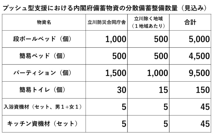 一方同じ政府発の、プッシュ型の備蓄数は全国のを集めても、仮設ベッドは9,500台、入浴資機材、キッチン資機材共に45セット(45箇所)です。
