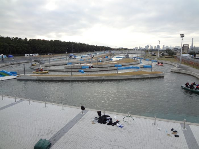 巨大な流水プールで、ちょうど4人乗りのカヌー?の競技が行われていました。