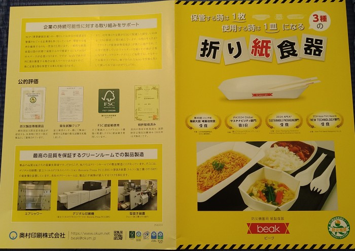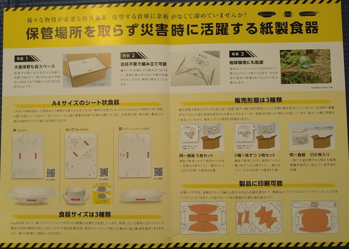丼、カップ、皿+スプーン・フォークの3点セットで保管時はA4サイズで厚さは2mmくらい。嵩ばらないのがいいですね。