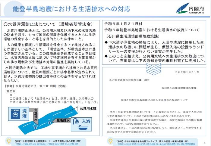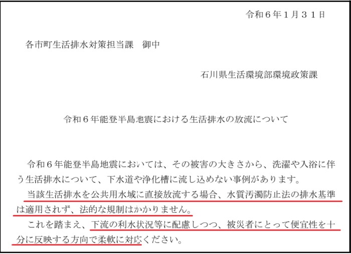 に対して「生活排水は工場などからの排水ではないので水質汚濁防止法の対象外であり、川や側溝に流しても法令的には問題ない。ただし放流先で農業や漁業などに利用されている可能性があり、配慮してください」という旨の通知が出されています。