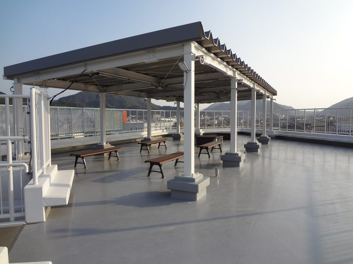 登り口は階段とスロープが並列にあり、スロープは1層目まで、階段は上層まで繋がっています。