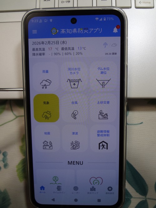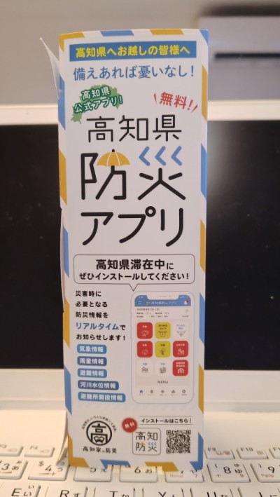 🔵ホテルに入ると机の上に「高知県防災アプリ」の案内が。
