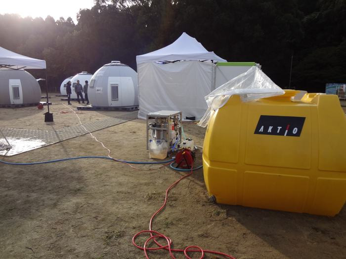 ↓私たちのブース。プールに張った水を浄化してシャワーと流し台から流しました