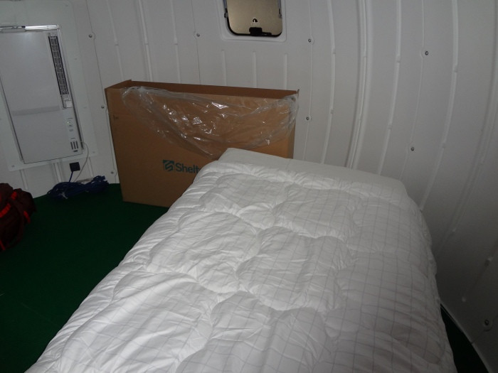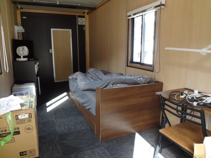 ↓テント内部:段ボールベッド、空調、寝具も完備